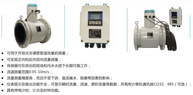 非滿管流量計顯示及輸出功能齊全,可顯示瞬時流量、流速、累積流量等數(shù)據(jù),并具有計算機通訊接口232、485(選配件);