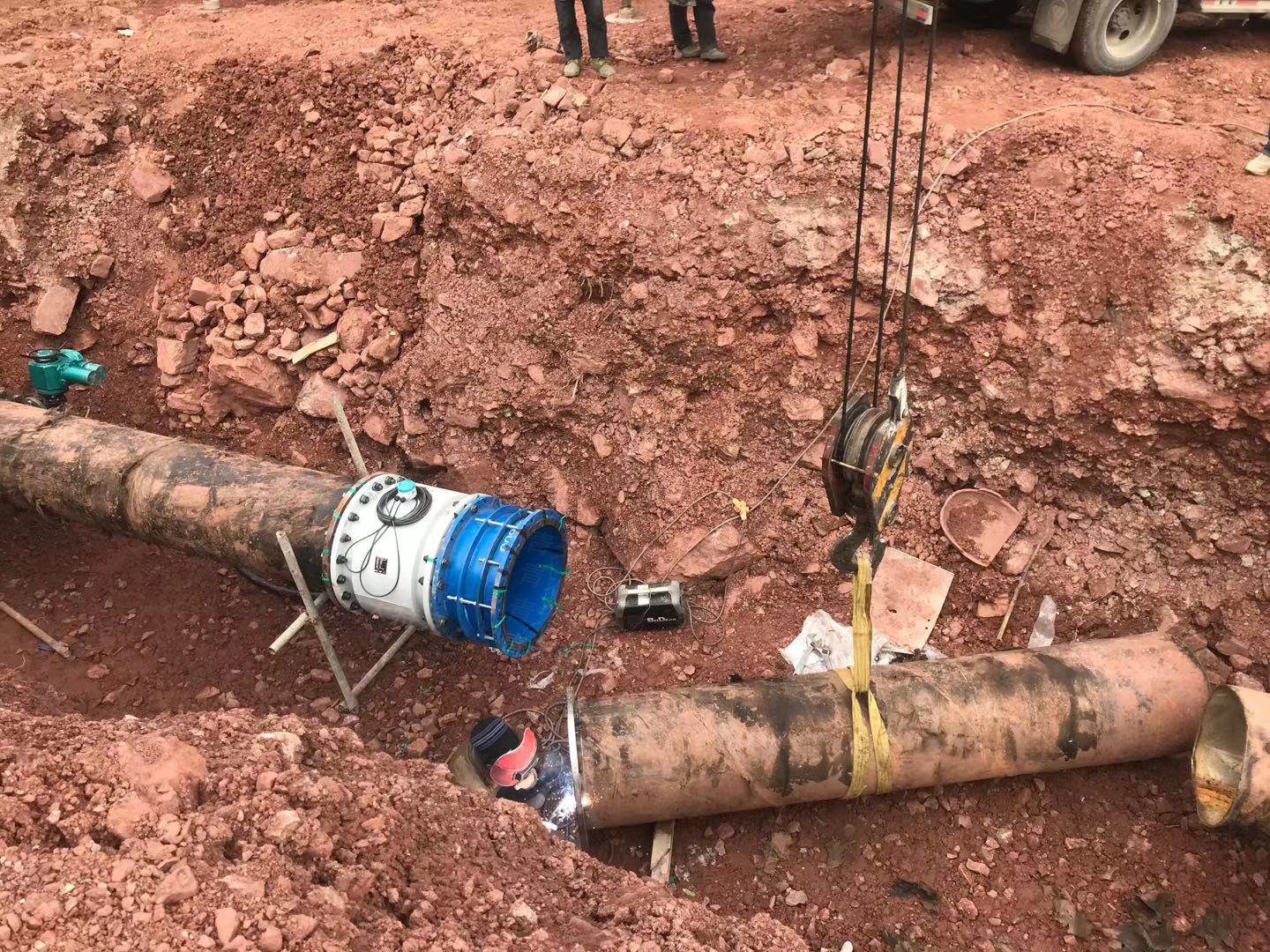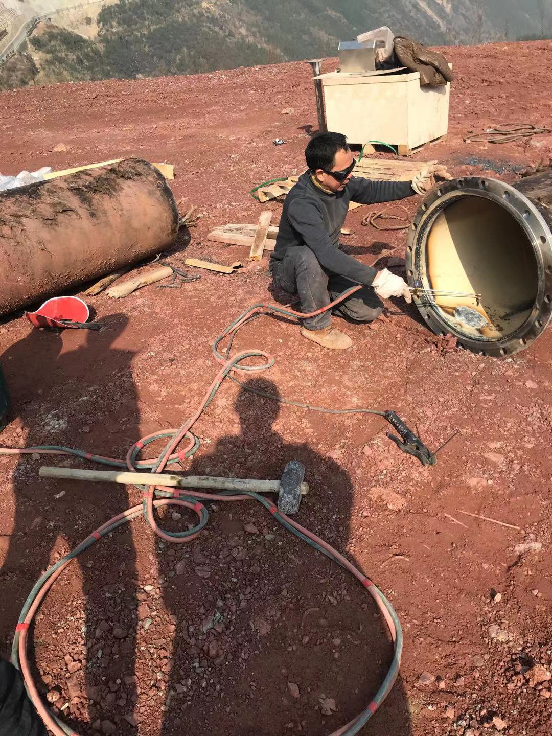 現(xiàn)場工作人員正在切割管道和焊接法蘭。